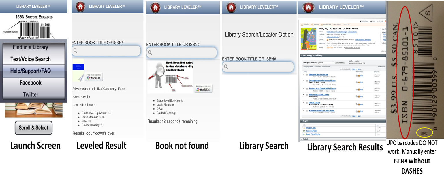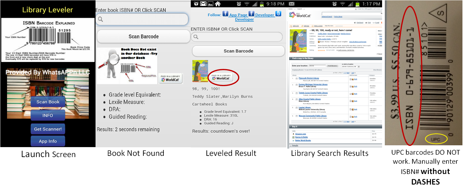 Manually TYPE OR VOICE INPUT the Title or ISBN# without dashes in the searchbox. Library Leveler Does not support UPC barcodes and some children's boxed sets. Any barcode with UPC written next to it is not a valid ISBN barcode. Make sure that you are scanning the ISBN and not the UPC of the book. The ISBN of 13 digits has been used since 1/1/2007 and will begin with the numbers "978". The ISBN of 10 alphanumeric characters will exist on books published before 1/1/2007.